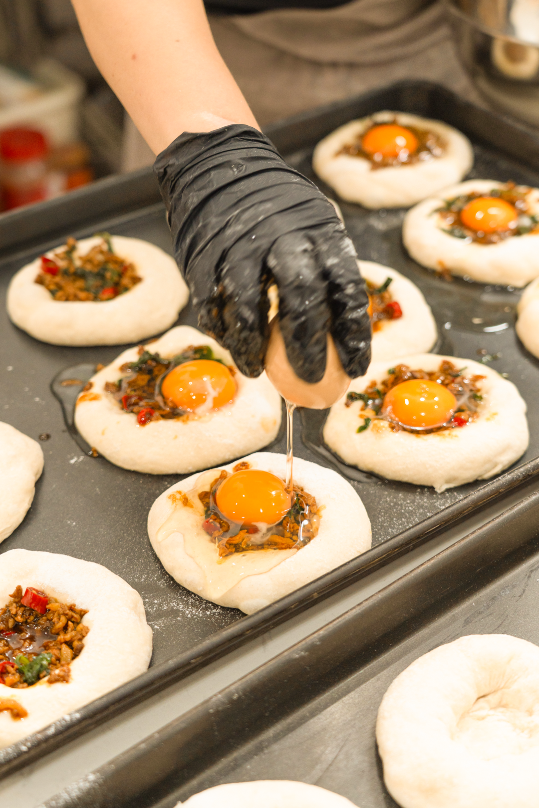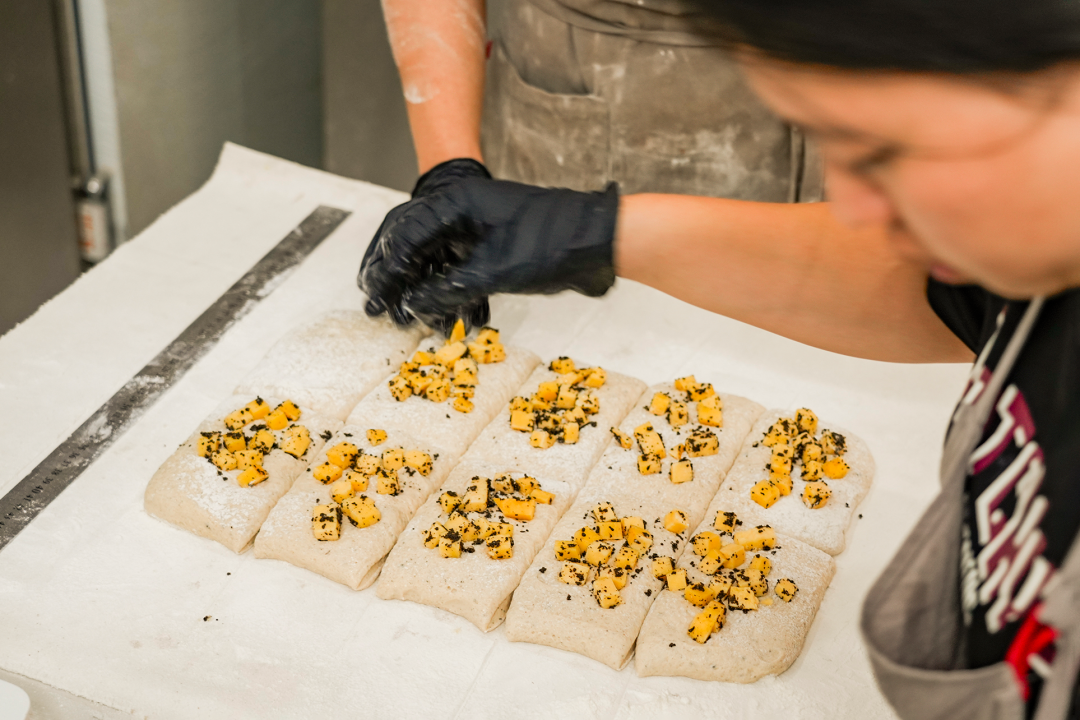 当柴窑的火光终于在店内亮起,如何让面包跳出传统口味的框架又成了她们需要攻克的新课题。在大多数面包店习惯使用进口面粉制作面包的背景下,阿琪和阿诗再次选择跳出常规思路,把心思花在了国产面粉的研究上。“现在国产面粉工艺已经很成熟,我们在反复试验后发现国产面粉在口感细腻度、麦香浓郁度上甚至能超越进口面粉”。为了让每款面包的口感达到最佳,她们还玩起了“面粉混搭”,让面团既保留每种面粉的优势,又能适配不同的口感。其间,两人还曾远赴外地拜访资深烘焙师,学习不同地域面包制作的工艺精髓与口味搭配技巧。闲暇时还会穿梭在东莞各镇街的餐饮场所,无论是街头巷尾的传统小吃店,还是新式烘焙店和特色餐馆,只为从不同风味中捕捉灵感。回到店里再结合经验不断尝试制作不同口味的各式面包——或在传统碱水包的基础上探索新的调味方向,或是尝试不同的馅料搭配:太阳打抛肉佛卡夏、香菜芝士牛肉恰帕塔、辣子鸡风味贝果……一系列跳出常规框架的面包刚上架就抓住了食客的味蕾。不少顾客尝过一次便念念不忘,有人每周蹲守上新,还有人一次囤三四个,多款“猎奇”口味长期占据小店“复购榜”前列,成了名副其实的“招牌款”。